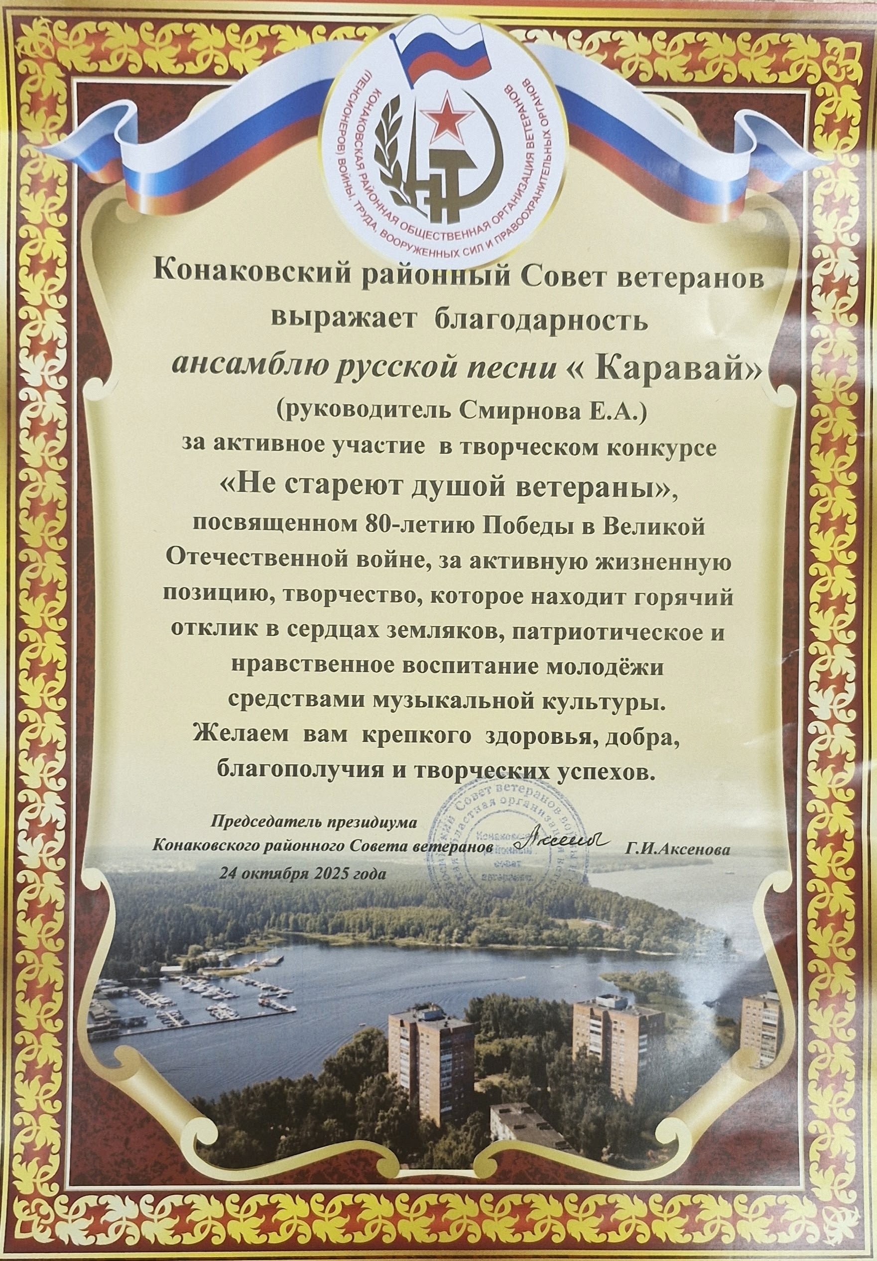 24 октября в ДК "Современник" Конаковский районный Совет ветеранов наградил участников творческого конкурса "Не стареют душой ветераны", посвящённого 80-летию Победы в Великой Отечественной войне за активную жизненную позицию, творчество, которое находит горячий отклик в сердцах земляков, патриотические и нравственное воспитание молодёжи средствами музыкальной культуры. В МБУ"КДЦ "ЗАВИДОВО" награды получили: